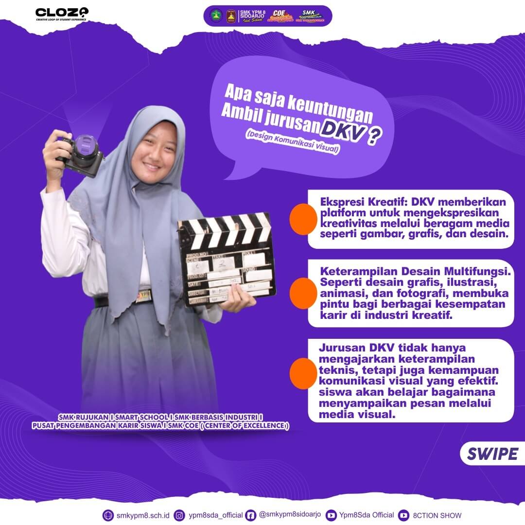 Jurusan DKV cocok untuk siswa yang memiliki minat di bidang seni, desain, dan komunikasi visual. Siswa akan belajar menciptakan karya desain grafis yang komunikatif dan menarik untuk berbagai media, baik cetak maupun digital. Lulusan DKV banyak dibutuhkan di industri kreatif seperti periklanan, media sosial, percetakan, dan animasi.