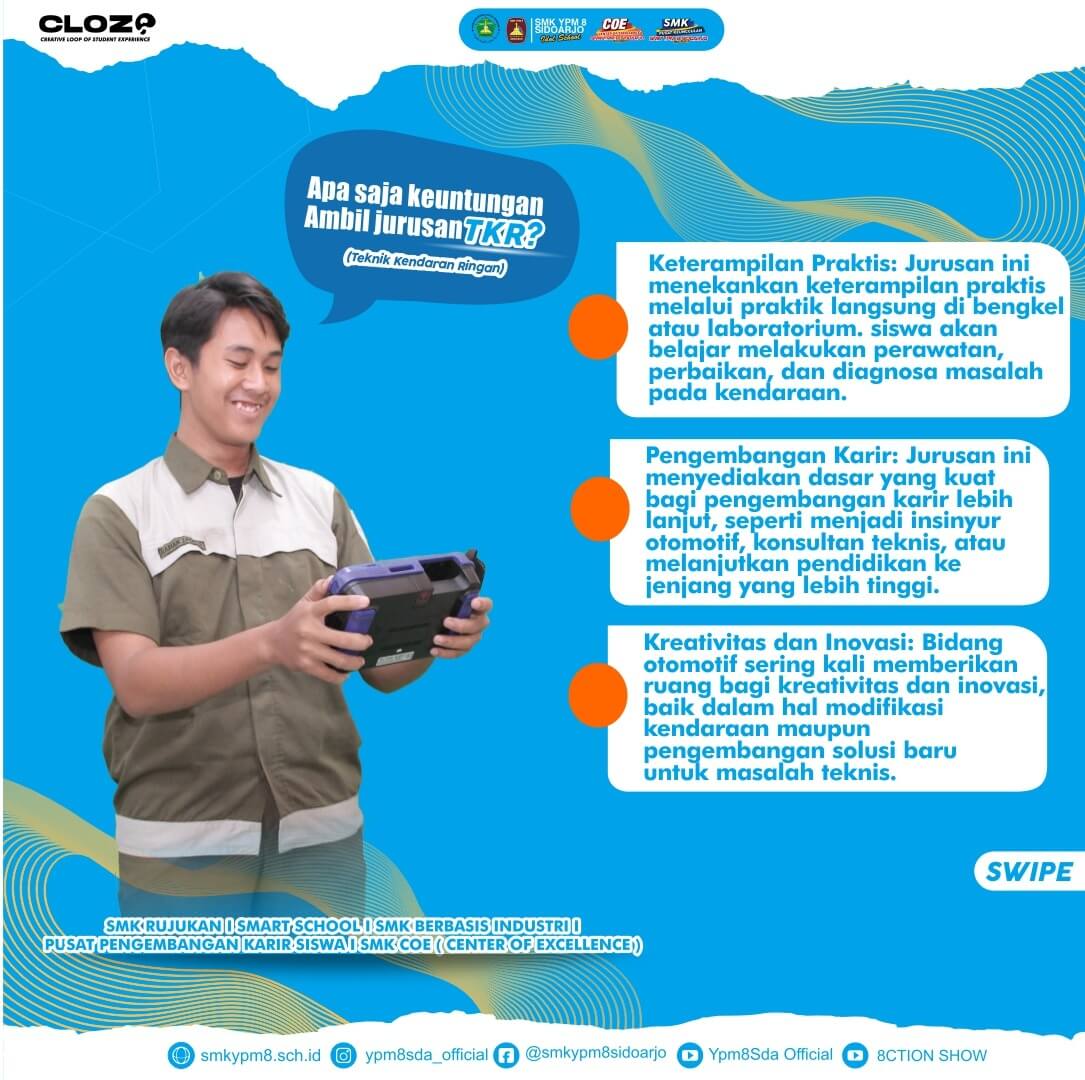 Jurusan TKRO sangat cocok untuk siswa yang menyukai dunia otomotif, khususnya mobil. Siswa akan mempelajari cara merawat dan memperbaiki berbagai sistem pada kendaraan ringan. Lulusan jurusan ini berpeluang bekerja sebagai mekanik profesional, teknisi bengkel resmi, atau membuka usaha bengkel sendiri.